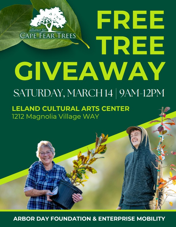 The Town of Leland is hosting a Tree Giveaway on Saturday, March 14, from 9 a.m. to Noon at the Leland Cultural Arts Center, located at 1212 Magnolia Village Way.