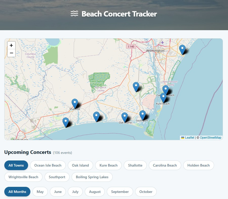 Brunswick County is home to great summer concerts many at beach locations. I have created this application to follow the concerts. You can even save the app to your home screen of your smart phone for handy reference. The app can be found at: https://beach-concert-finder.lovable.app/